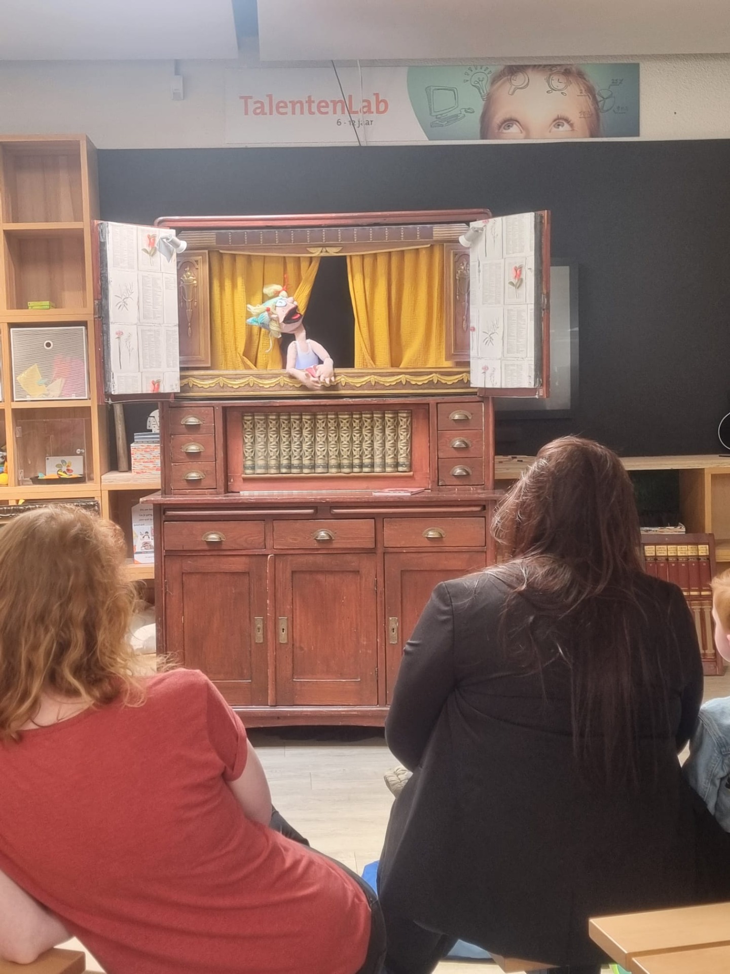Deze bijzondere poppenkast zit vol met verhalen die niet kunnen wachten om verteld te worden. Het lijkt een gewone boekenkast, maar als je beter kijkt zie je dat de kast vol zit met verrassingen. Achter elk laatje of luikje kan er een pop tevoorschijn komen. Er zitten zelfs leuke geluids- en lichteffecten in verstopt!